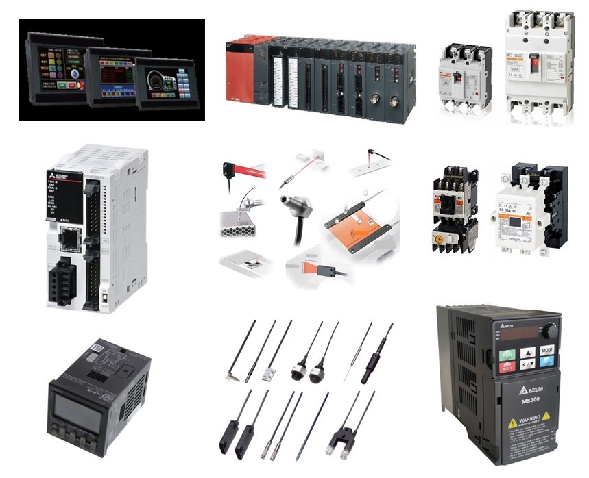 自動控制元件、PLC . 人機介面HMI . 無熔絲開關 . 電磁開關 . 電源供應器 . 變頻器 . 電磁閥 . 計時器 . 控制電錶 . 訊號轉換器(傳送器) . 光電開關 . 雷射感測器 . 近接感測器 . 光纖感測器 . 壓力.轉速.電流.重量.流量.測距.溫濕度..等感測器