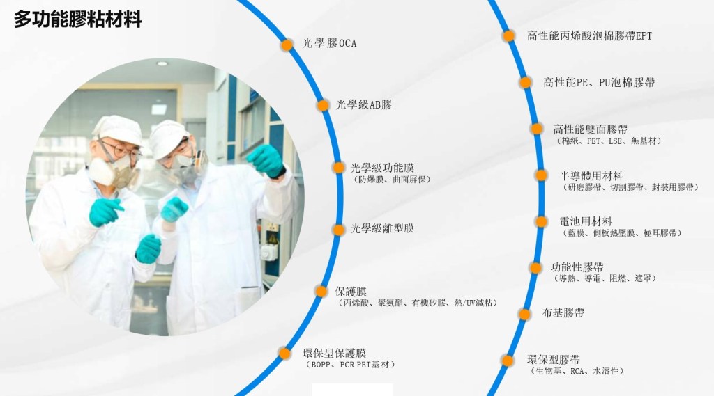 多功能膠粘材料是一系列包括工業膠帶、泡棉膠帶、保護膜、防爆膜、功能膜、半導體應用膠帶、EPT、OCA等產品的綜合性產品系列。這些產品具有優異的黏附性和多功能性,廣泛應用於工業、電子等領域。
